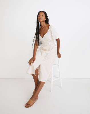 Puff Sleeve Button Wrap Midi Dress In Undyed Stripe